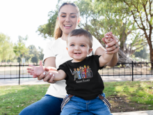 • T-shirt bébé humoristique de la marque Okiwoki (marque française spécialisée dans la Parodie) représentant une parodie stylée et pleine d'humour de Eddard, Catelyn, Robb, Sansa, Arya, Brian et Rickon and Tony Stark (caricature de Robert Downey Jr) de Game of Thrones